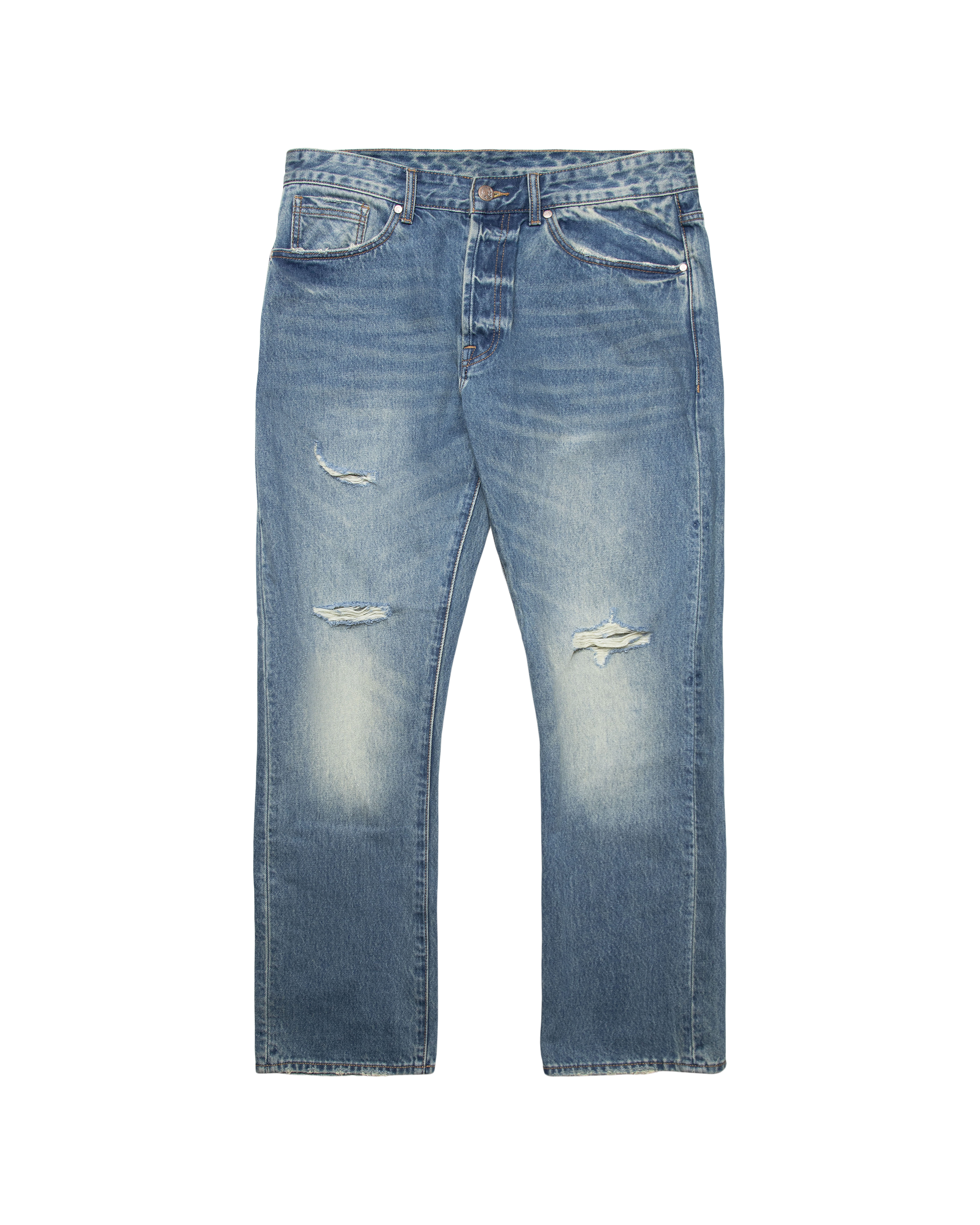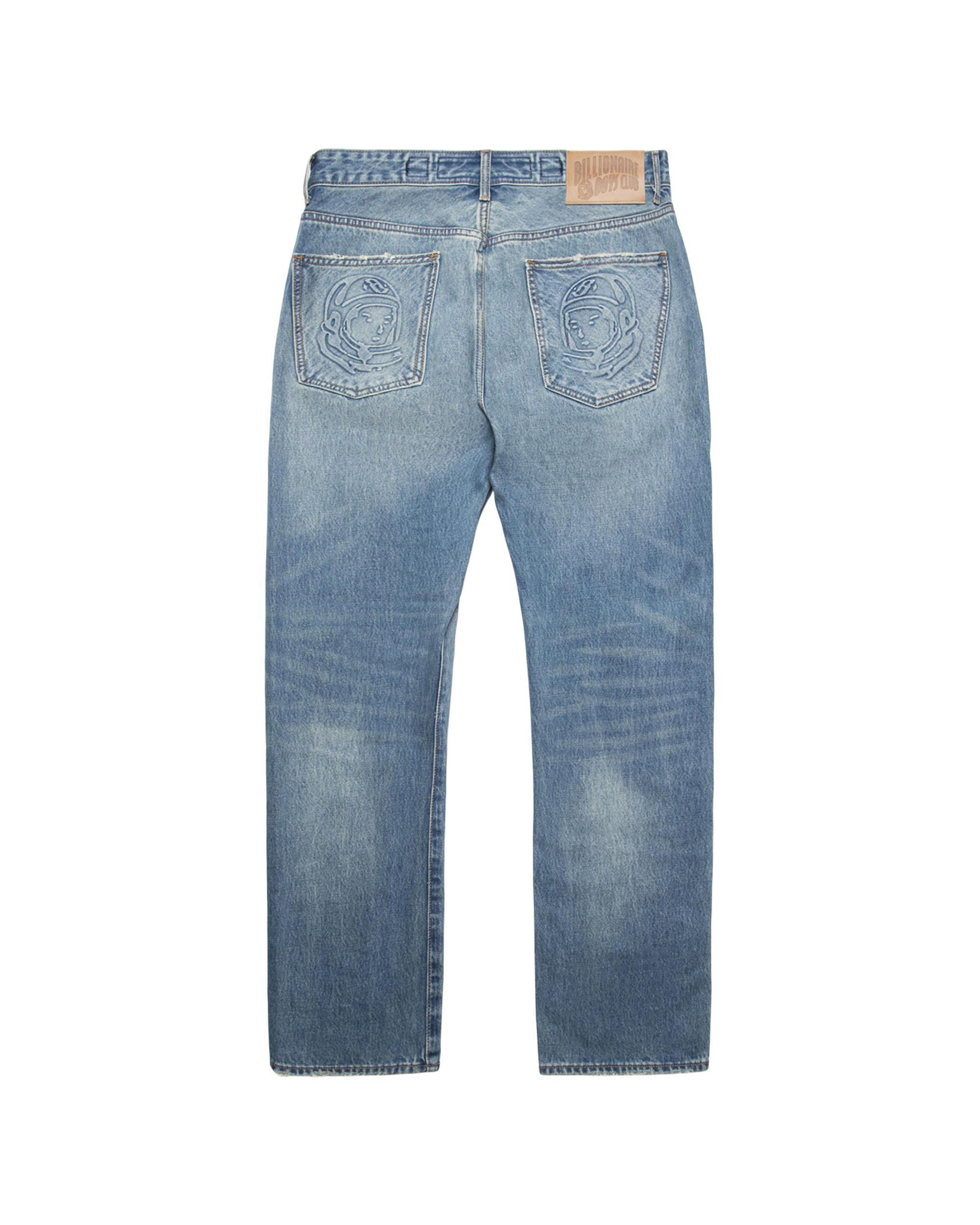 Denim jeans featuring a distressed front design. highlighted by an embroidered graphic of Helmet Heads on the back.