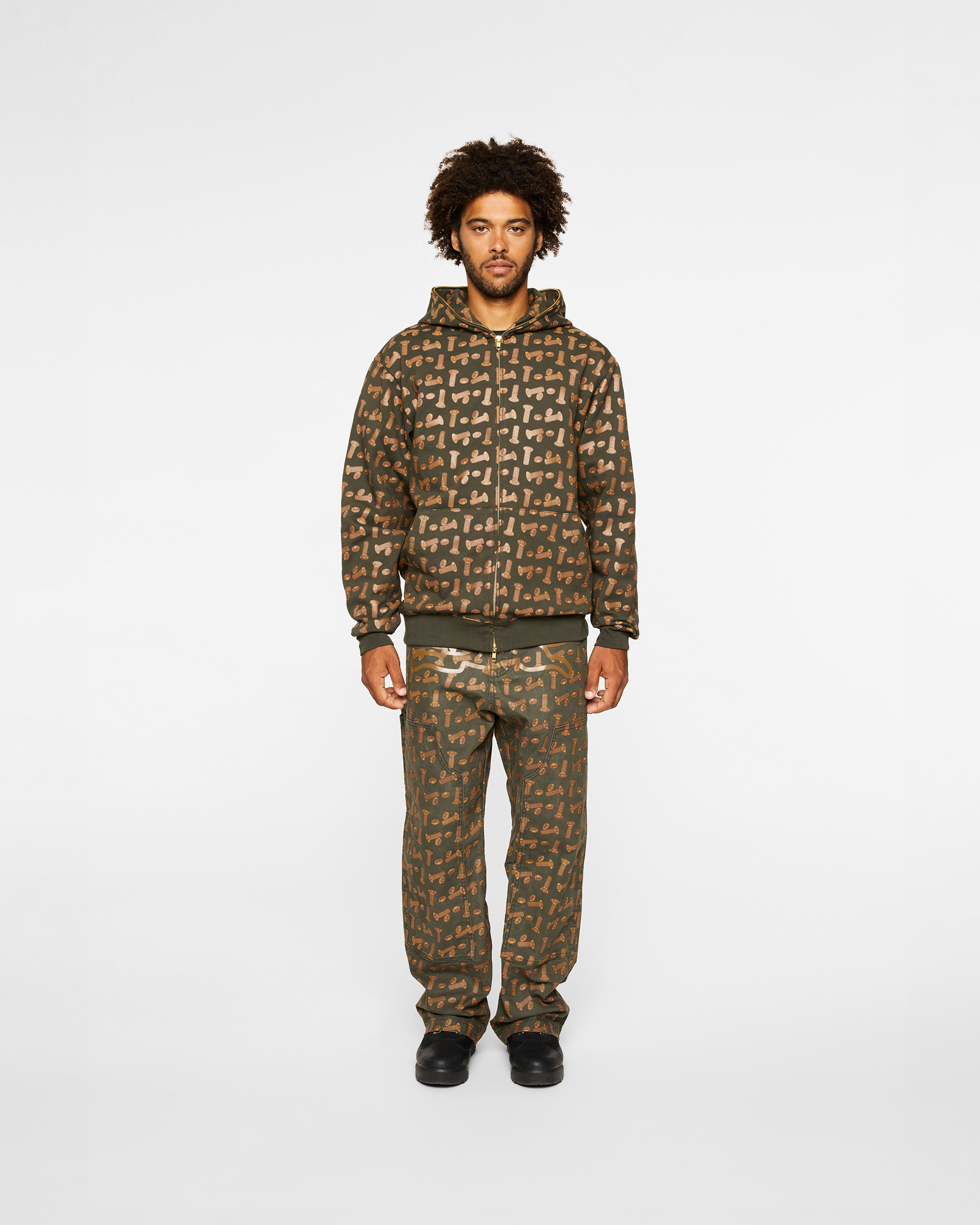 ICECREAM x BRONZE 56K Hardware Full Zip Hoodie features an all-over screw graphic print with a full zip closure and front pouch pockets.